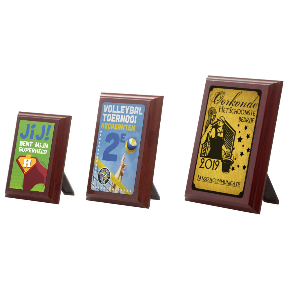 Houten standaard leverbaar in 3 maten: 75x100 mm, 90x125 mm, 105x150 mm en verkrijgbaar met eigen ontwerp of sublimatie afbeelding. Ontwerp uw eigen prijs.