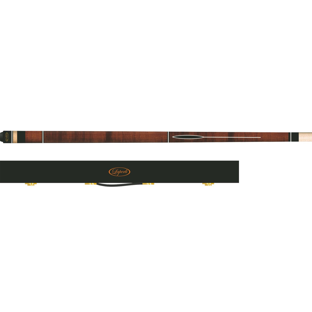 Deze stijlvolle biljartkeu heeft een bruine butt met onder en boven de bruine grip een strakke UV-print in wit en zwart. De Laperti Lavis 4 biljartkeu wordt geleverd inclusief zwarte Laperti keukoffer. De butt van de Laperti biljartkeu is gemaakt van maple, heeft een lengte van 72 cm en is voorzien van een 19 mm zwart plastic butt cap met daarop een goudkleurig decal Laperti logo. De tweedelige Laperti Lavis biljartkeu heeft een totaal lengte van 141 cm. De Laperti Lavis biljartkeu heeft een wooden joint (houten schroef verbinding), een 25 mm zwart plastic joint collar en een 10mm ferrule. De shaft van de Laperti Lavis biljartkeu is gemaakt van massief maple en heeft een lengte van 69 cm. De tip heeft een diameter van 11,5 mm bij een keu met een gewicht van 480-490 gram en 12 mm bij een gewicht van 500-540 gram.